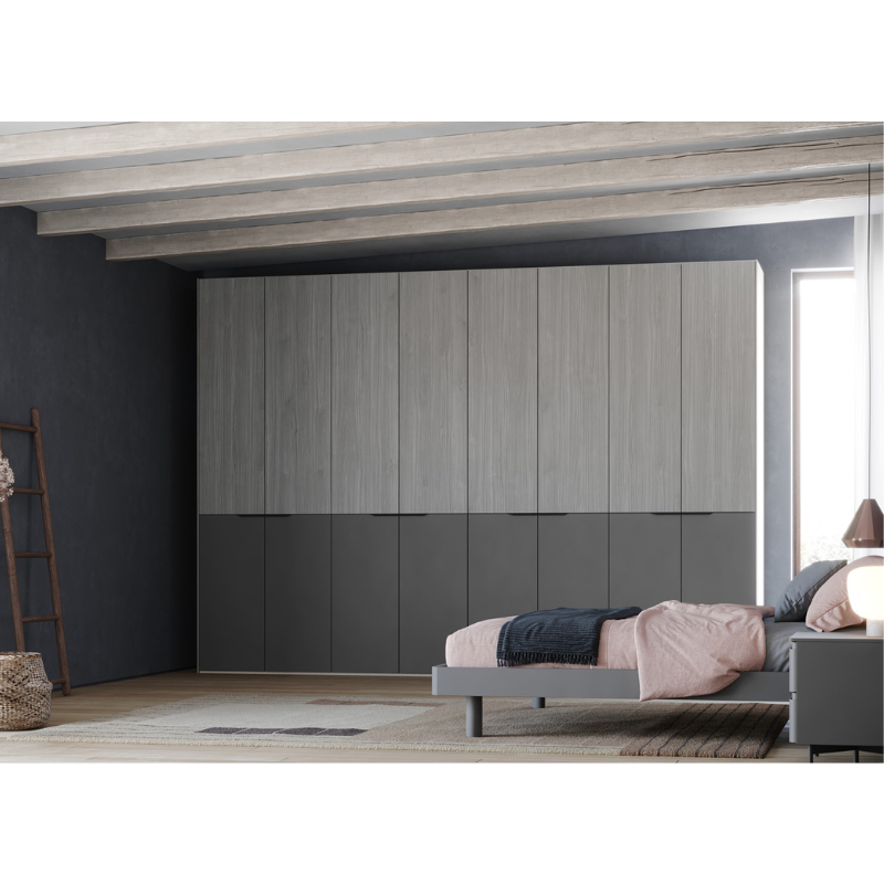 La parte superiore, caratterizzata da ante in finitura effetto legno chiaro, dona calore e naturalezza all’ambiente, mentre la sezione inferiore in tonalità grigio scuro aggiunge profondità e un tocco moderno. Il design pulito, privo di maniglie a vista, valorizza la linearità della composizione e rende l’armadio perfetto per ambienti minimal e sofisticati.