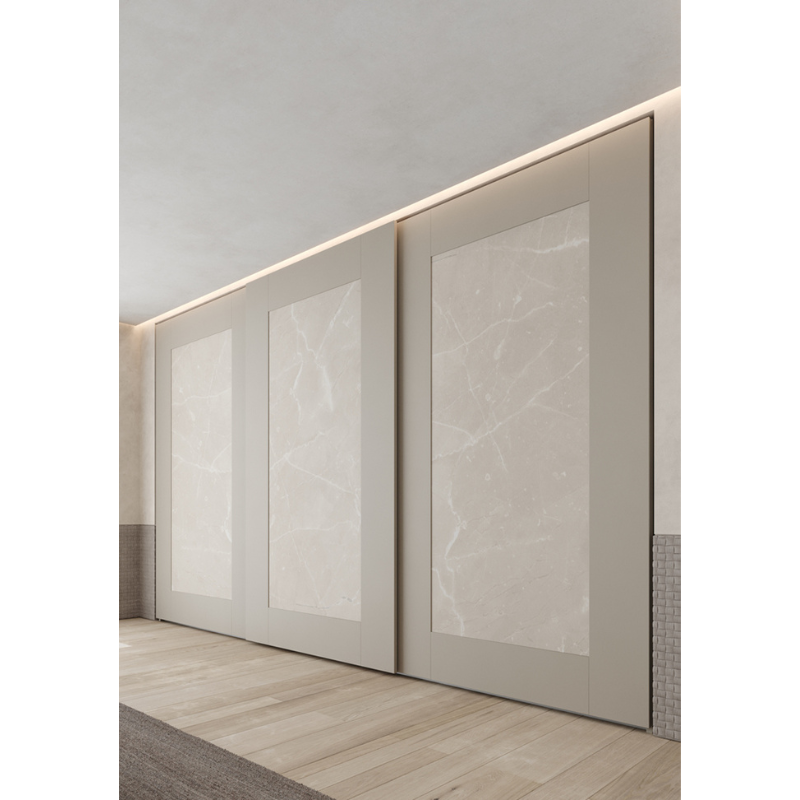 Armadio scorrevole dal design moderno con eleganti inserti effetto marmo. Una soluzione raffinata che unisce estetica contemporanea e funzionalità, ideale per ottimizzare lo spazio nella zona notte.