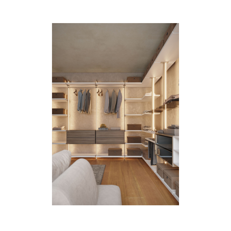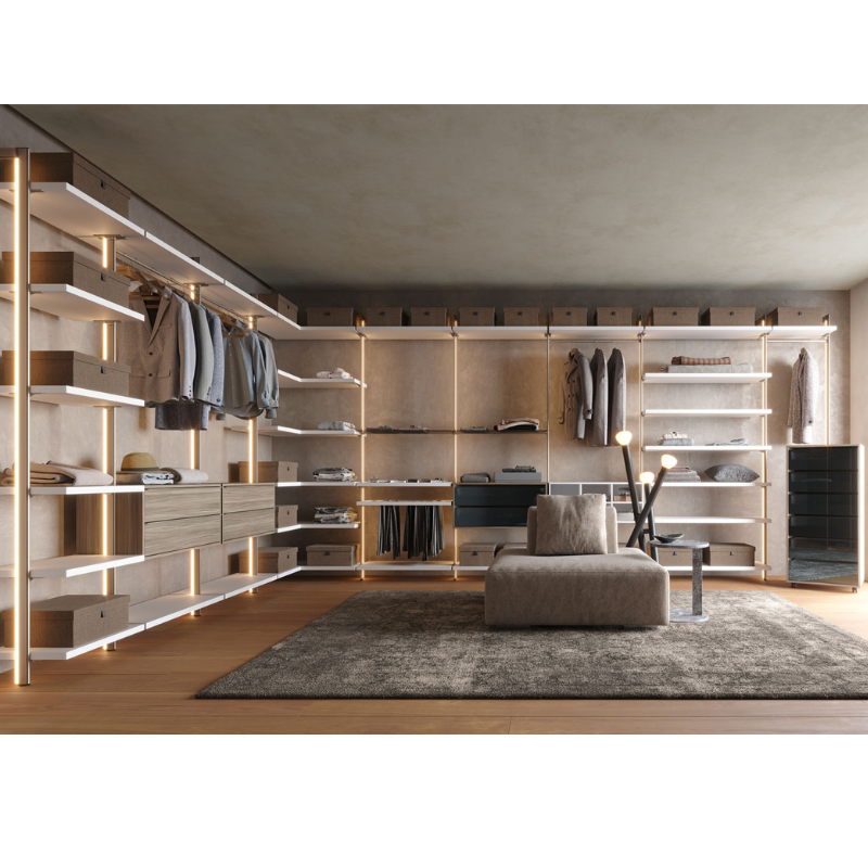 Il sistema è progettabile su misura e si adatta perfettamente sia a stanze dedicate sia a nicchie o spazi della camera da letto, valorizzando l’ambiente con uno stile contemporaneo e minimal. I materiali e le finiture disponibili consentono inoltre di personalizzare l’estetica della composizione, rendendo la cabina armadio non solo funzionale, ma anche un vero elemento di design.