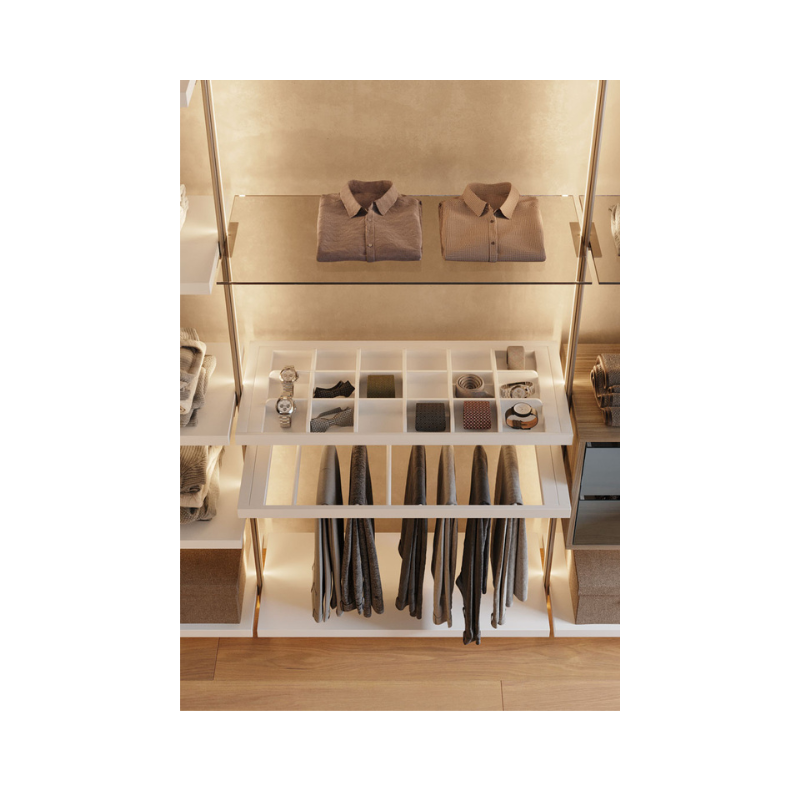 Grazie alla sua grande modularità, la cabina armadio può essere configurata in base alle esigenze di spazio e di utilizzo, permettendo di combinare diversi elementi interni per ottenere un’organizzazione pratica e personalizzata di abiti, scarpe e accessori.