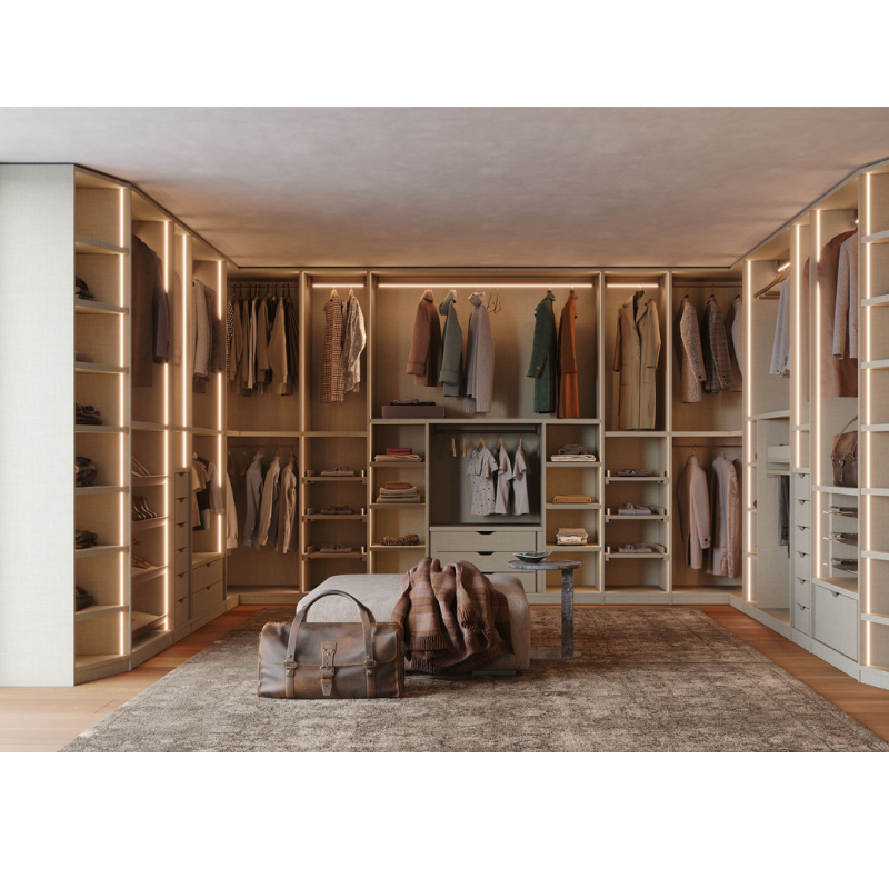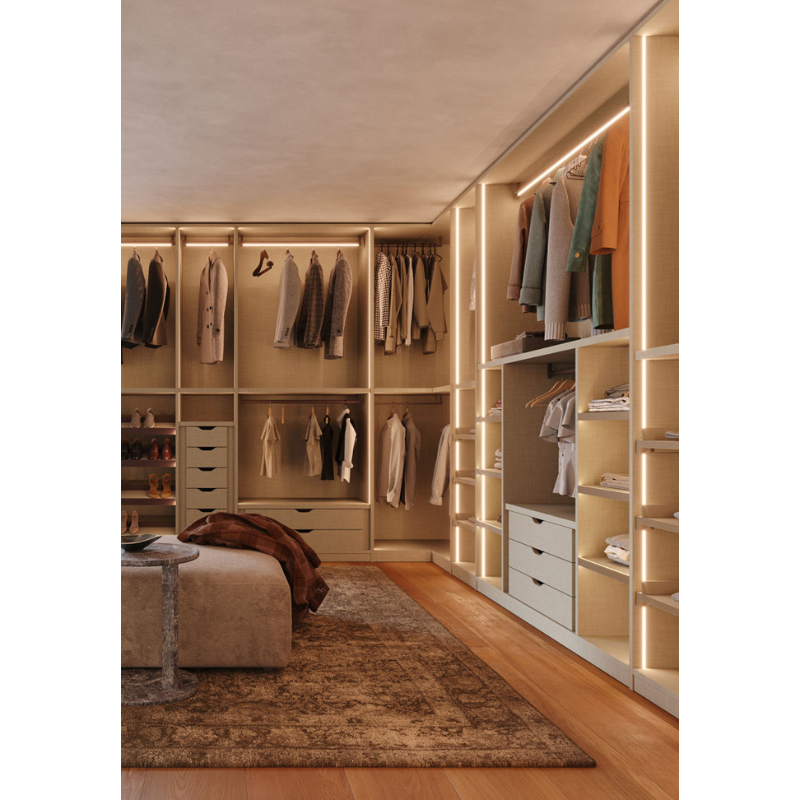 Le finiture e i materiali disponibili consentono di personalizzare l’estetica della cabina armadio, integrandola perfettamente con l’arredamento della zona notte e creando un ambiente moderno, ordinato e funzionale.