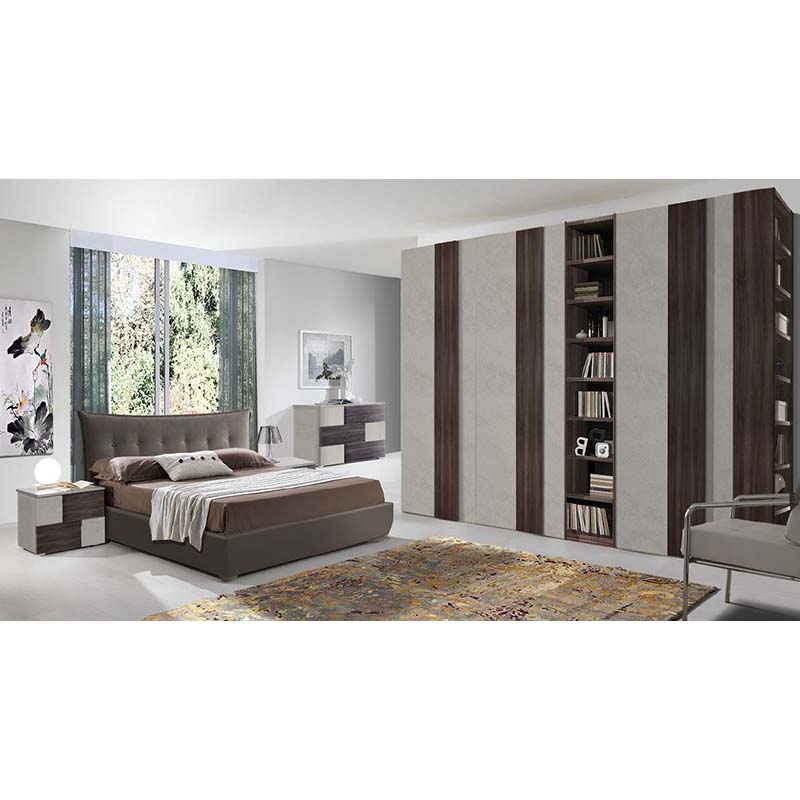 Elemento distintivo della composizione è l’armadio ad ante battenti con doppia libreria terminale e centrale, impreziosito da maniglioni a tutta altezza in colore noce dark, che uniscono praticità e design. La libreria integrata aggiunge uno spazio utile per libri, oggetti decorativi o accessori, rendendo l’armadio ancora più funzionale.