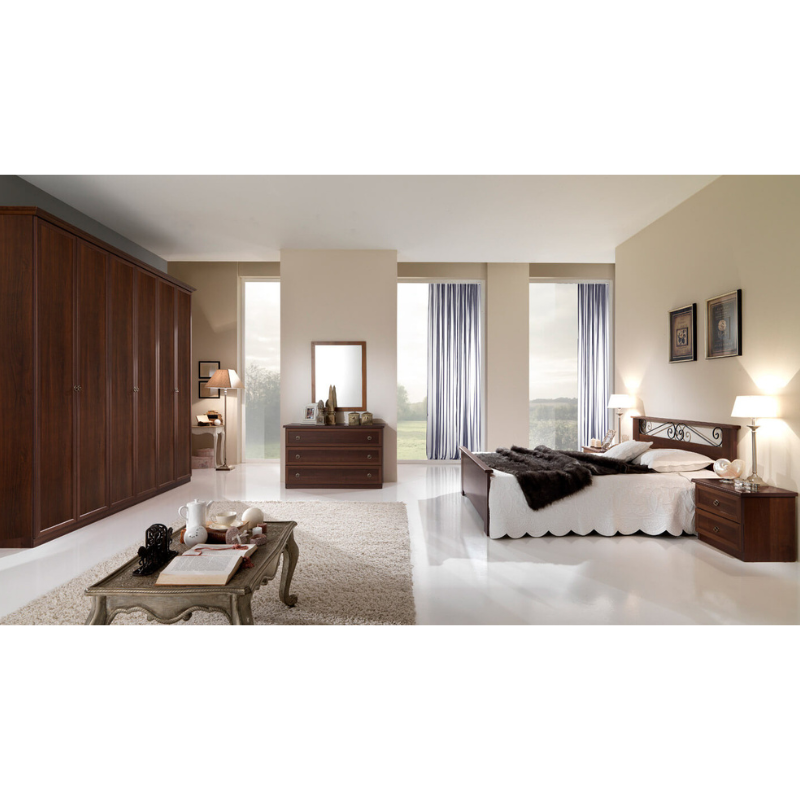 Elemento distintivo della composizione è l’armadio a 6 ante battenti con cornice decorativa, che conferisce alla camera un aspetto importante e curato nei dettagli. Il letto matrimoniale con testiera decorata in ferro battuto aggiunge un tocco di eleganza grazie alle sue linee sinuose e ricercate.