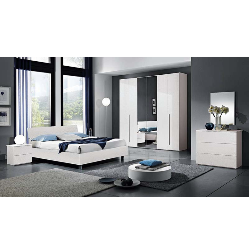 Il protagonista della composizione è l’armadio a 6 ante battenti, progettato per offrire grande capienza e sfruttare al meglio lo spazio disponibile. Le due ante centrali con specchio aggiungono luminosità alla stanza e contribuiscono ad ampliare visivamente l’ambiente.