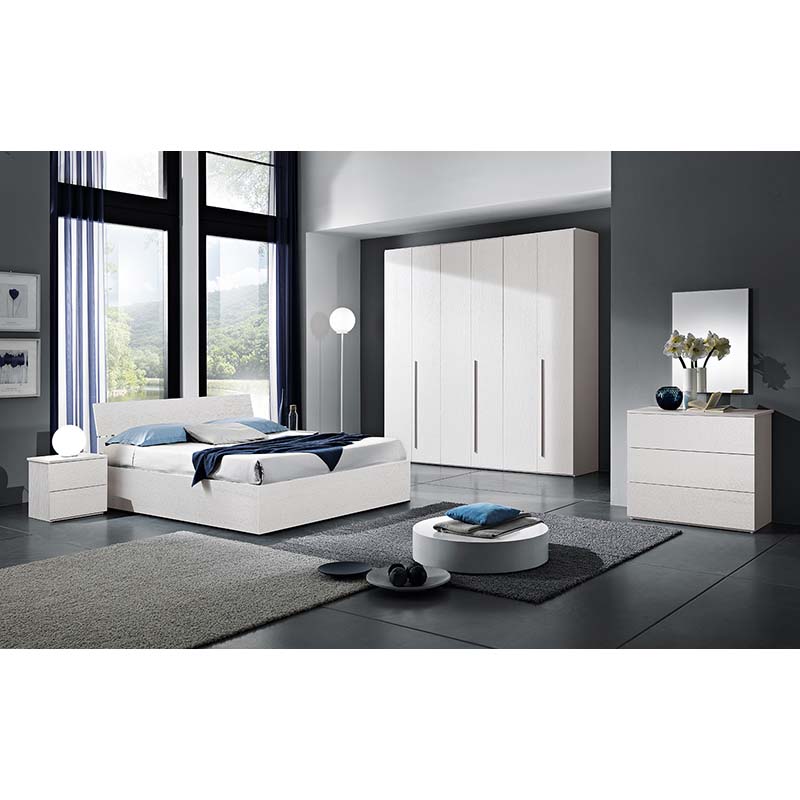 Il gruppo notte coordinato, composto da comò a tre cassetti, due comodini e specchiera, completa la composizione con uno stile armonioso e funzionale.
