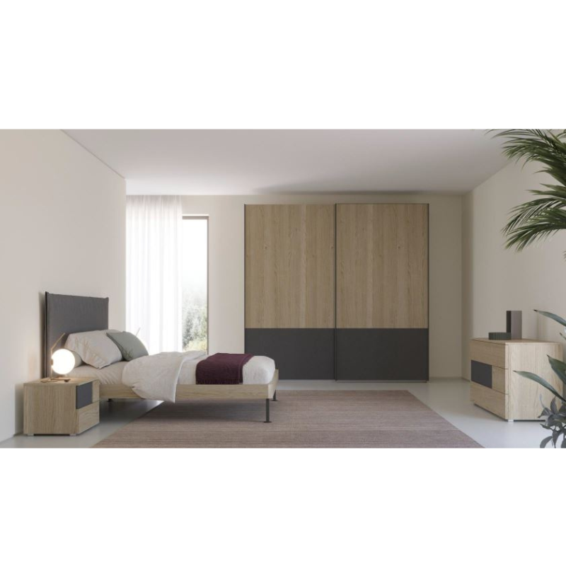 Il protagonista della composizione è l’armadio a 2 ante scorrevoli, caratterizzato da ante con pannelli in contrasto rovere nodato e laccato opaco piombo che valorizzano il design pulito del frontale.