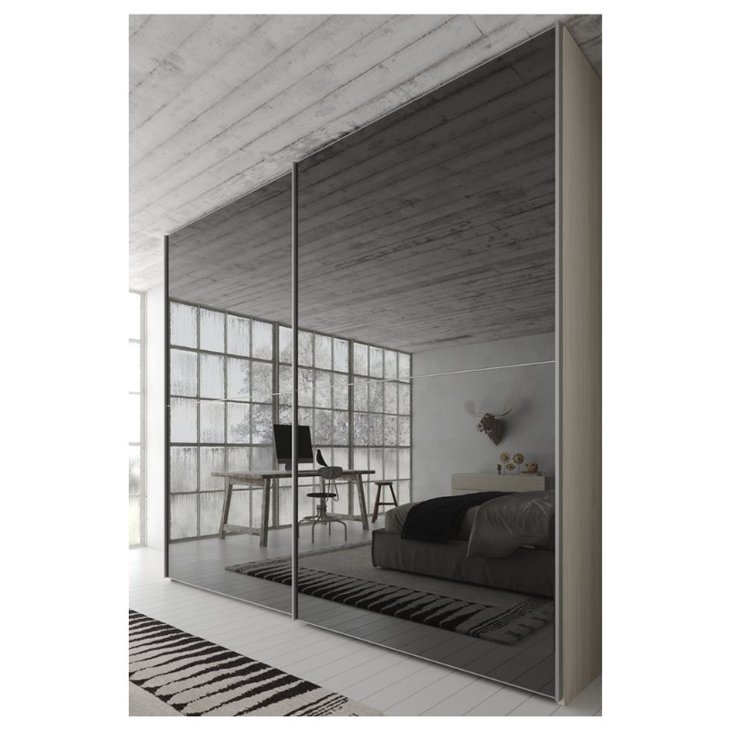 Elemento principale della composizione è l’armadio a due ante scorrevoli, caratterizzato da fianco in nobilitato, telaio in alluminio e quattro inserti a specchio fumé o vetro. Il sistema di apertura scorrevole permette di ottimizzare gli spazi della stanza, mentre gli inserti a specchio donano luminosità e profondità all’ambiente.
