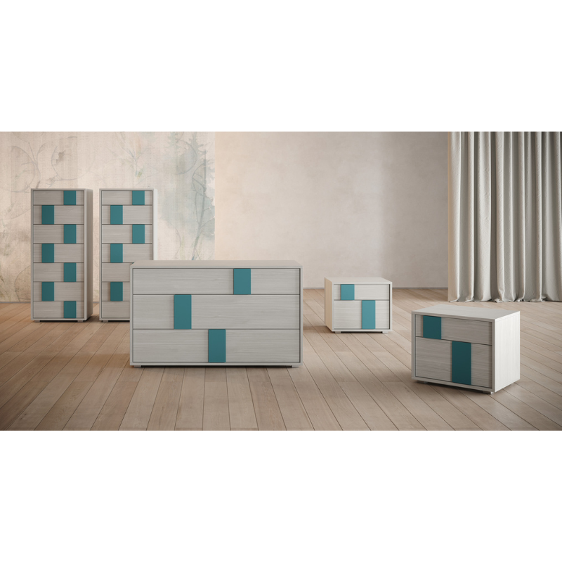 Il gruppo notte Tokio, composto da comò a tre cassetti e due comodini coordinati, riprende le finiture calce con maniglie in noce dark, creando una composizione armoniosa e moderna.