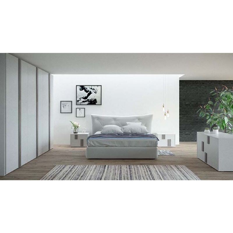 Camera completa dal design moderno ed elegante, composta da armadio 6 ante battenti con maniglioni a tutta altezza, letto matrimoniale con contenitore in ecopelle vintage, comò e 2 comodini coordinati.