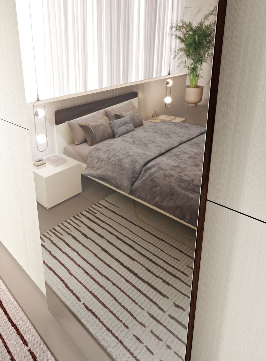 Elemento protagonista della composizione è l’armadio a tre ante scorrevoli con anta specchio centrale, caratterizzato da linee pulite e moderne. Il sistema di apertura scorrevole consente di ottimizzare gli spazi della stanza, rendendo l’armadio ideale anche per ambienti dove è necessario evitare ingombri durante l’apertura delle ante.