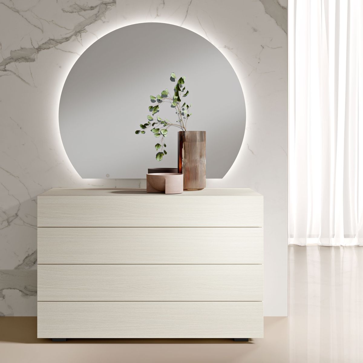 La composizione è completata dal gruppo notte Vega, composto da comò a tre cassetti e due comodini coordinati, nelle eleganti finiture corda e noce vanguard, che donano continuità estetica all’arredamento.