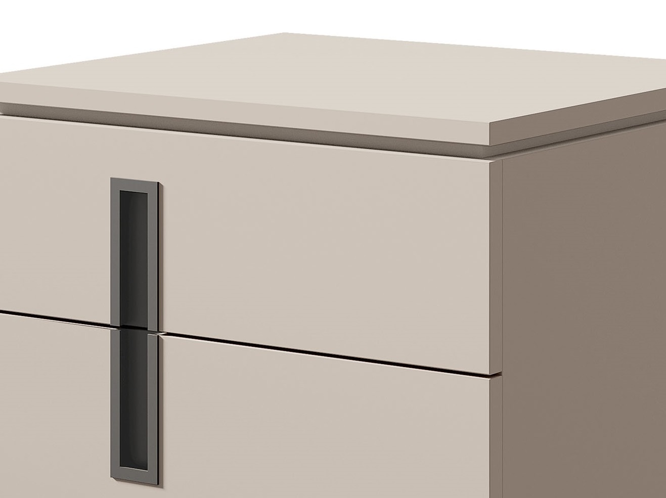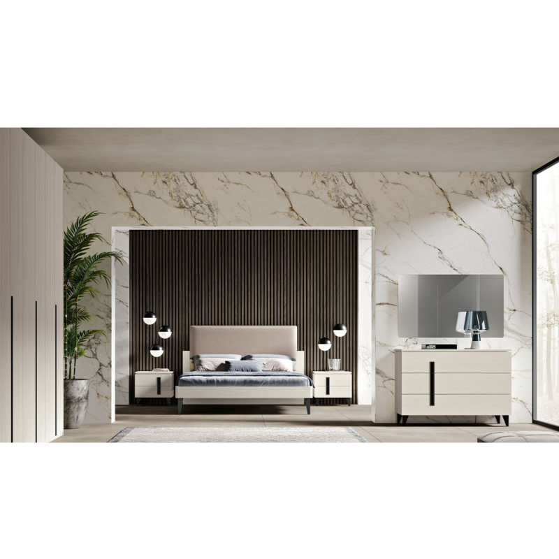 La composizione è completata dal gruppo notte Sirio, composto da comò a tre cassetti e due comodini coordinati, nelle eleganti finiture corda e noce vanguard, che donano continuità estetica all’arredamento.