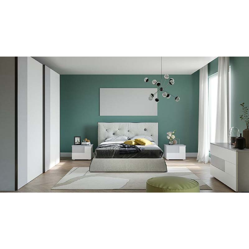 Camera completa dal design moderno ed elegante, composta da armadio 2 ante scorrevoli, letto matrimoniale con contenitore, comò e 2 comodini coordinati.