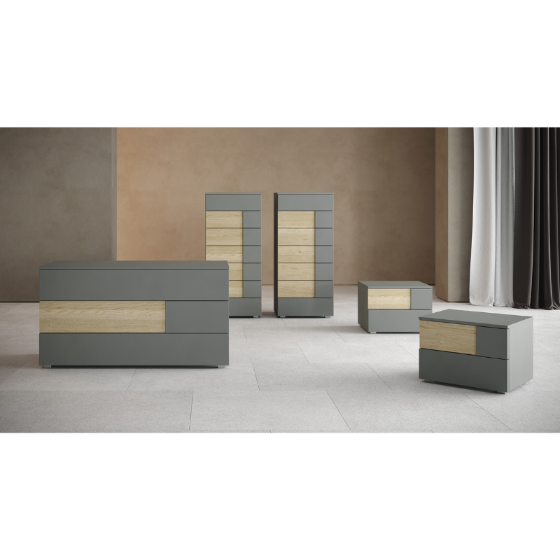 La composizione è completata dal gruppo notte coordinato, composto da comò a tre cassetti e due comodini, nelle eleganti finiture gesso e laccato opaco, che creano continuità estetica con il resto dell’arredamento.