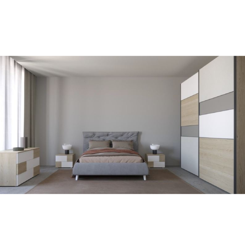 La Camera Matrimoniale Tender è una composizione completa dal design moderno e raffinato, perfetta per arredare la zona notte con stile e funzionalità. L’abbinamento delle finiture bianco frassinato, calce e rovere nodato, unite al telaio grafite dell’armadio, crea un ambiente elegante e luminoso, ideale per una camera contemporanea.