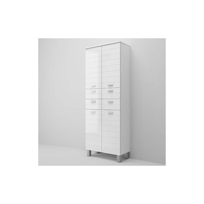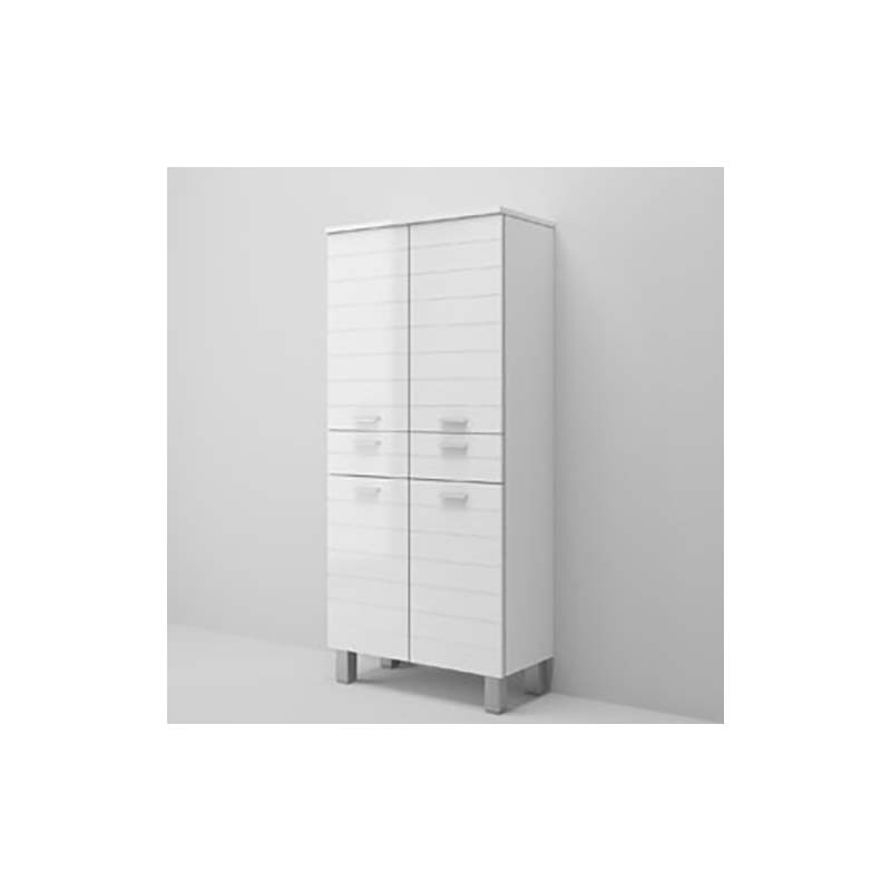 Colonna multiuso due ante Rigo è realizzata in finitura laccato bianco. La composizione è possibile averla in finitura laccato lucido, caratterizzato da frontali dogati. Ante e cassettoni in legno, mensole in vetro e maniglia in metallo. Il mobile bagno Rigo è un mobile a terra dotato di piedini in metallo che agevolano la pulizia del pavimento lasciando uno spazio utile per il passaggio della scopa.