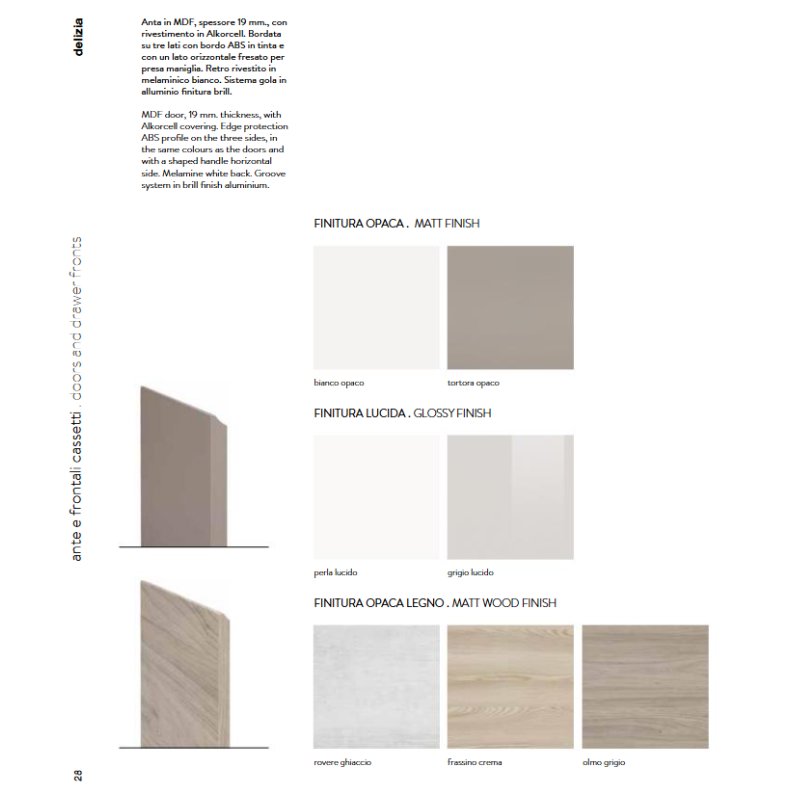 Le ante sono realizzate in MDF nobilitato spessore 19 mm, con certificazione CARB, e rivestite in PET eco-compatibile oppure in ALKORCELL a base di polipropilene (PP), materiali resistenti e sicuri per l’ambiente domestico.