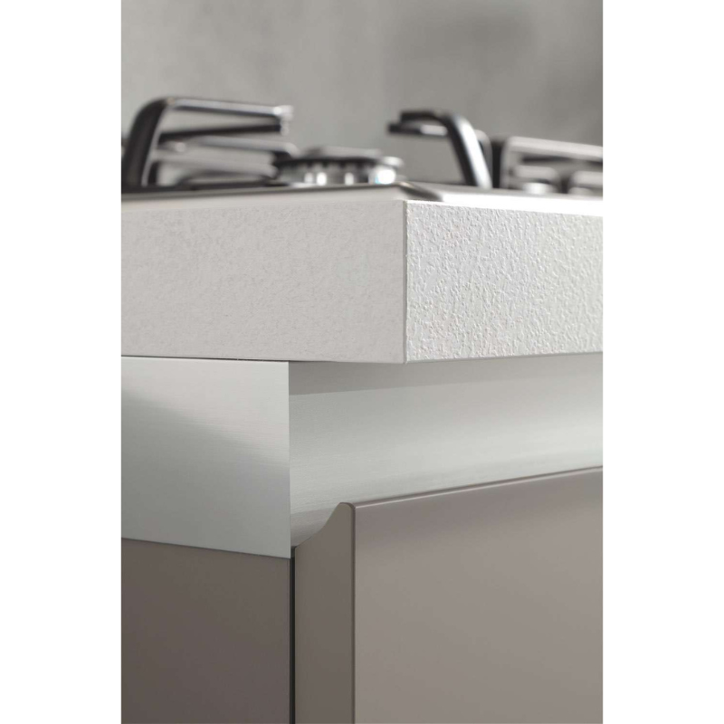 Il design è valorizzato dalla presa maniglia integrata ottenuta tramite fresatura orizzontale e dal sistema gola in alluminio, disponibile in finitura brill o nero, per un’estetica pulita e contemporanea.