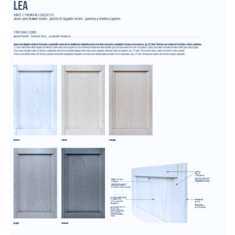 Le ante della Cucina Lea hanno spessore 22 mm, con pannello centrale in nobilitato impiallacciato frassino, garanzia di solidità e qualità nel tempo.