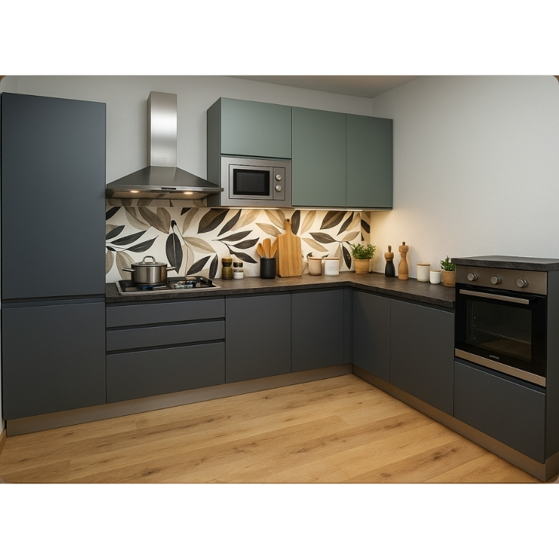 La Cucina New Kelly è una cucina moderna e versatile, progettata per chi cerca qualità, estetica e funzionalità. Le ante in MDP da 19 mm con maniglia integrata e la chiusura ammortizzata garantiscono comfort d’uso e durata nel tempo. La composizione si distingue per moduli armonici e abbinamenti di colori che si adattano a ogni ambiente contemporaneo.