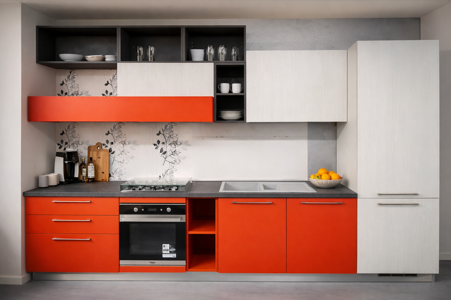 La Cucina Red è una composizione completa e funzionale, ideale per chi desidera una cucina pronta consegna a prezzo outlet, senza rinunciare alla qualità.