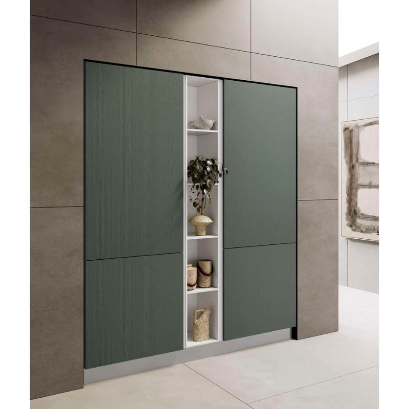 Le ante sono realizzate in nobilitato con rivestimento melaminico spessore 18 mm, complete di bordo ABS in tinta e retro rifinito in melaminico coordinato. Il sistema gola in alluminio, disponibile in finitura brill o nero, dona un tocco contemporaneo ed elegante.