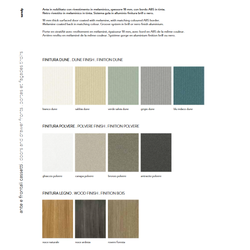 Finitura Dune: Bianco Dune, Sabbia Dune, Verde Salvia Dune, Grigio Dune, Blu Indaco Dune