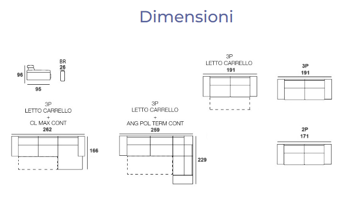 DIVANO CON PENISOLA E LETTO A CARRELLO L. 262 X  P. 166