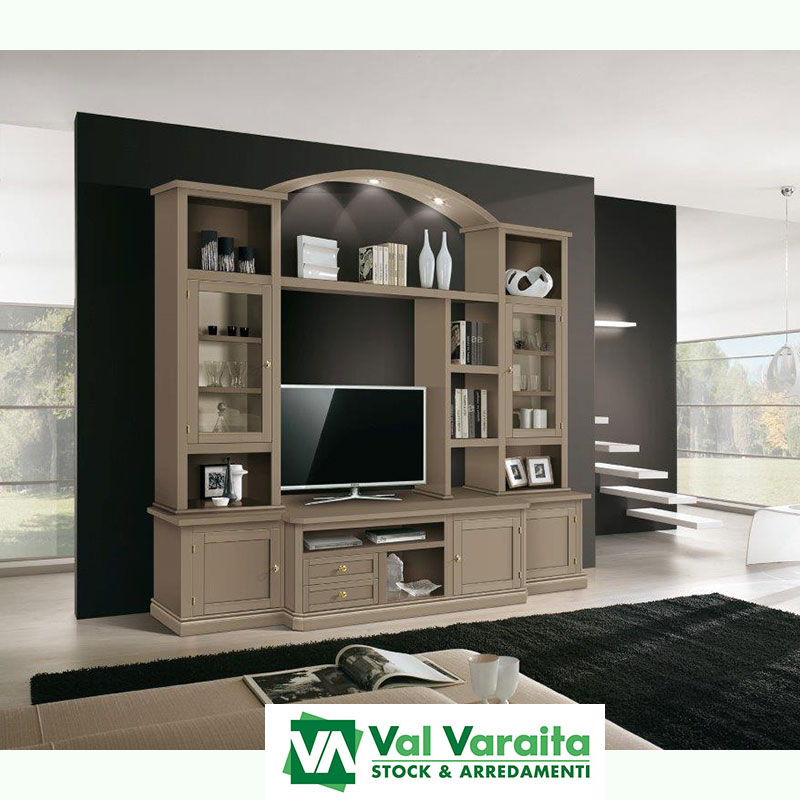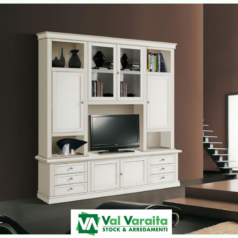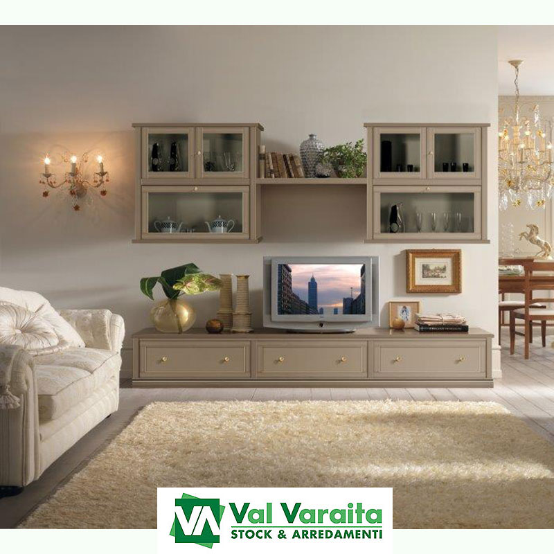 Si possono realizzare composizioni utilizzando parti chiuse bugnate oppure vetrinette scegliendo il vetro liscio oppure decorato per una duplice funzione di contenimento ed esposizione. Nella parte centrale della sala si inserisce un corpo avanzato, più profondo rispetto alle altre basi per poter appoggiare la base della televisione ed avere anche lo spazio utile per i fili di collegamento dei sistemi oppure semplicemente lasciando un vano vuoto per poter appendere la televisione al muro.