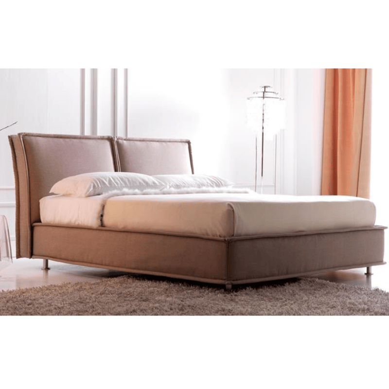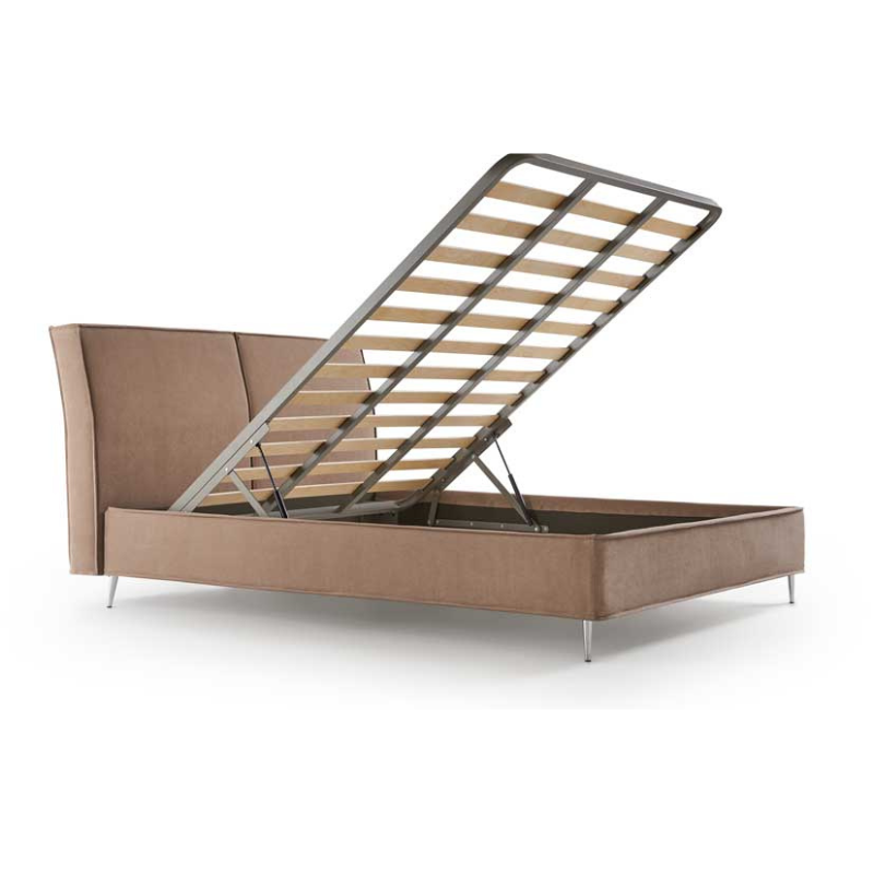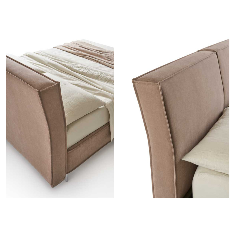 La testata imbottita a due cuscini morbidi offre un sostegno confortevole, ideale per i momenti di relax, lettura o riposo. Oltre all’estetica curata, Bordò è progettato per offrire la massima praticità: il sistema di apertura della rete permette di accedere facilmente a un ampio contenitore, perfetto per riporre biancheria, cuscini e cambi di stagione, ottimizzando lo spazio in camera da letto.