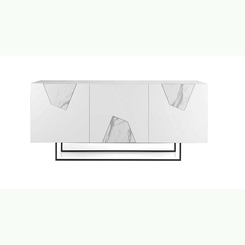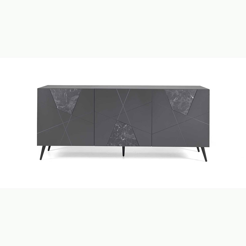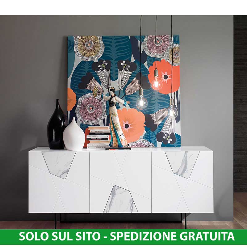 La credenza ADEL ha una finitura con scocca in nobilitato ed ante in mdf pantografate. Inserti in vetro effetto marmo o specchio. Poggia su una base in metallo verniciato nero oppure si possono mettere i piedini a richiesta, vengono inseriti bensì 5 piedini al posto dei classici 4 questo per garantire maggior stabilità. Adel non presenta cassetti ma solamente ante apribili. Interessante l’accostamento tra anta liscia e gli inserti in marmo oppure in specchio.