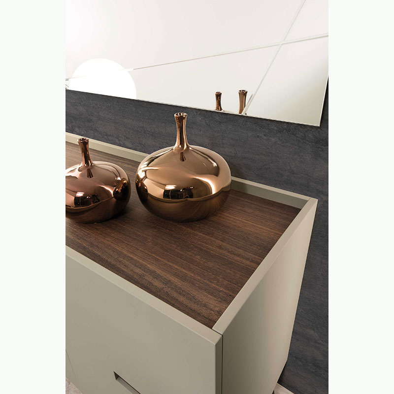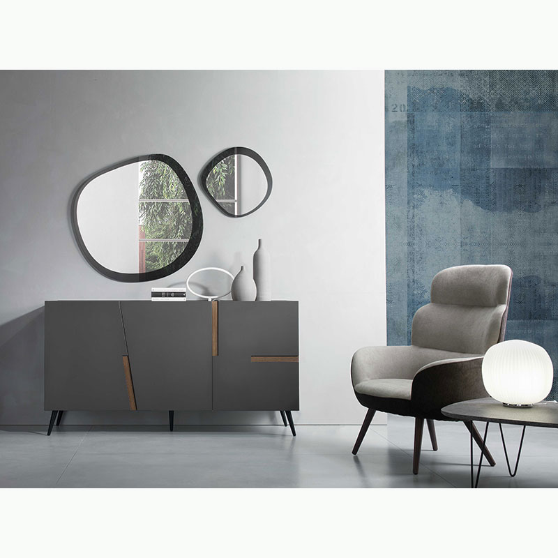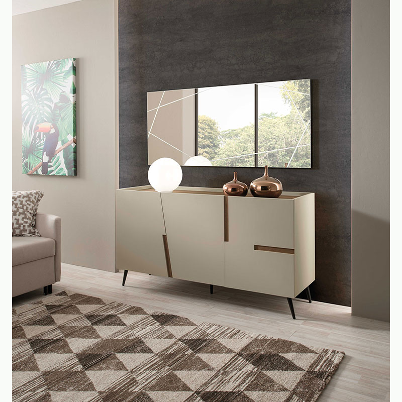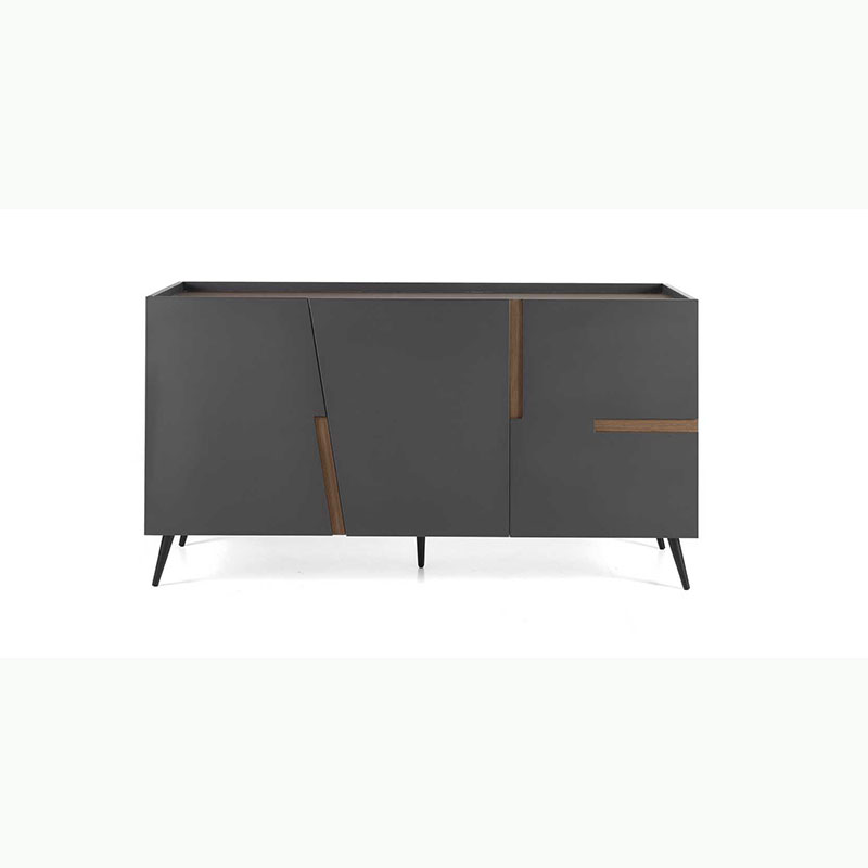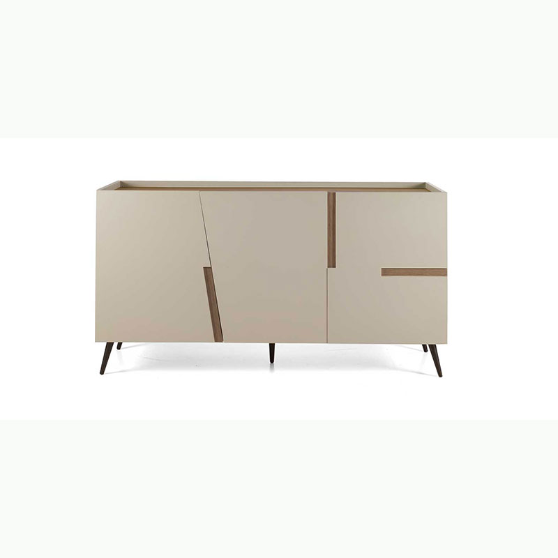 La credenza GIRONA ha una finitura con scocca in nobilitato ed ante in mdf laccato. Piano superiore ed inserti sulle ante effetto tek. Poggia su piedini in metallo verniciato nero , vengono inseriti bensì 5 piedini al posto dei classici 4 questo per garantire maggior stabilità. Girona non presenta cassetti ma solamente ante apribili. Interessante l’accostamento tra anta liscia e gli inserti in tek.