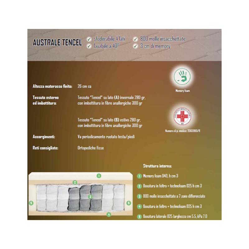 Il materasso Australe Tencel è realizzato con 800 molle insacchettate a 7 zone differenziate, rivestito da 3 cm di memory foam. Il molleggio indipendente reagisce al peso del corpo e di adatta alle sue forme in maniera progressiva; le molle sono racchiuse singolarmente in uno speciale involucro ed indipendenti tra loro, in modo che possano agire su vari punti di pressione  del corpo ed adeguarsi ad ogni movimento, ottenendo un sostegno differenziato più efficace nella zona lombare ed accogliente nelle altre zone. La versione 800 molle risulta più rigida nella sua portanza.
