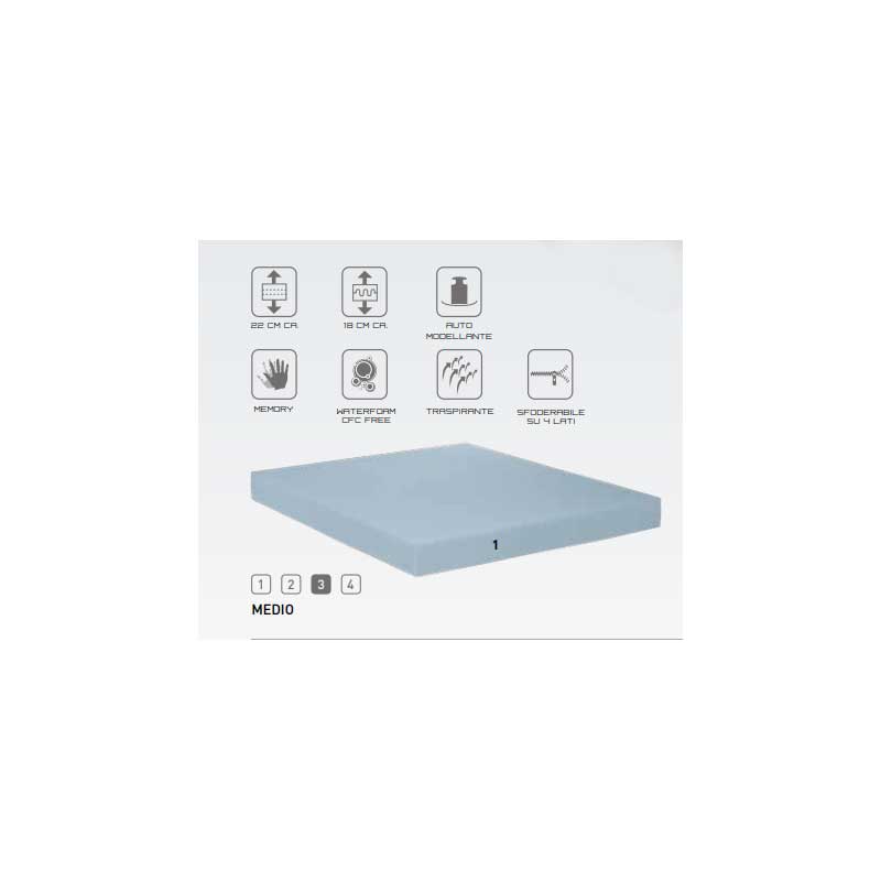 Materasso memory sleep in tessuto a maglia Basic Strech. Composto al 100% da fibre con proprietà anallergiche. Ha un’imbottitura in Memory Foam visco-elastico. Inoltre è un materiale automodellante capace di adattarsi perfettamente ad ogni parte del corpo. Garantisce infatti un sostegno adeguato e un confort straordinario. L’extra Soft Foam nell’imbottitura, conferisce ancora di più maggiore comodità a tutta la struttura. In aggiunta a questo, la fibra garantisce soprattutto una perfetta climatizzazione in tutti i periodi dell’anno. La lastra interna è un blocco unico in Waterfoam senza CFC. Ultimo, ma non meno importante ha una speciale lavorazione Air Transpiration studiata in modo tale che vengano creati dei passaggi di aria. Questo per garantire un riposo sano all’insegna del benessere.