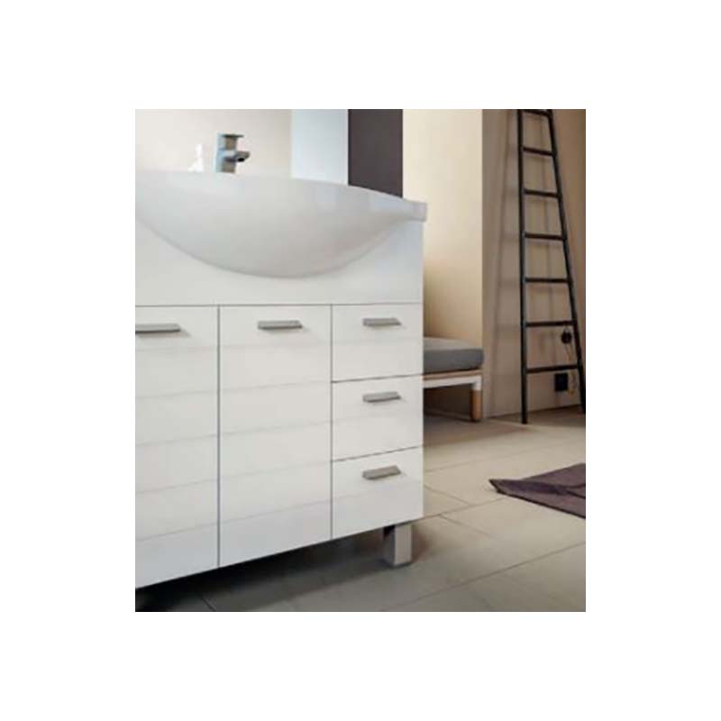 La base porta lavabo è dotata di: due ante nella versione da 65 cm e due ante e tre cassetti nella versione da 85 e 105 cm, questo permette di poter riporre gli asciugamani e i prodotti per il bagno in modo ordinato. Nella versione da 85 e 105 cm oltre la specchiera con led è presente anche un’anta aggiuntiva. Infine il lavabo è incluso nel prezzo.
