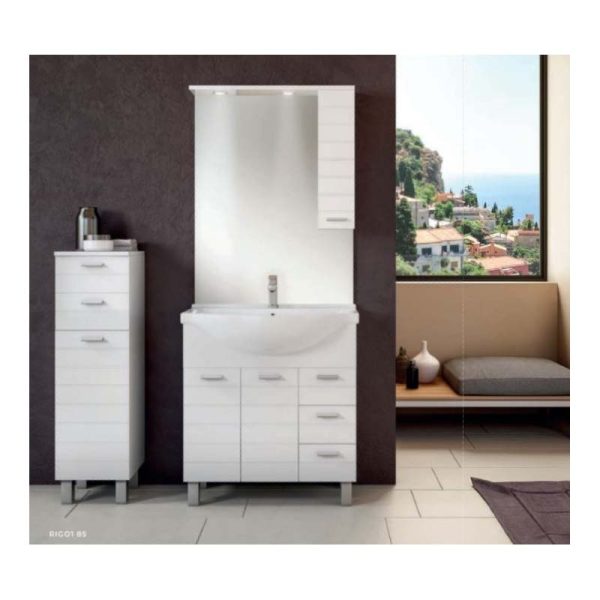 Il mobile Bagno Rigo è realizzato in finitura laccato bianco lucido. La composizione è possibile averla in finitura laccato lucido, caratterizzato da frontali dogati. Ante e cassettoni in legno, mensole in vetro e maniglia in metallo. Il mobile bagno Rigo è un mobile a terra dotato di piedini in metallo che agevolano la pulizia del pavimento lasciando uno spazio utile per il passaggio della scopa.