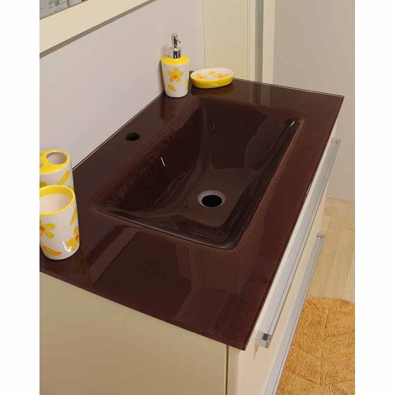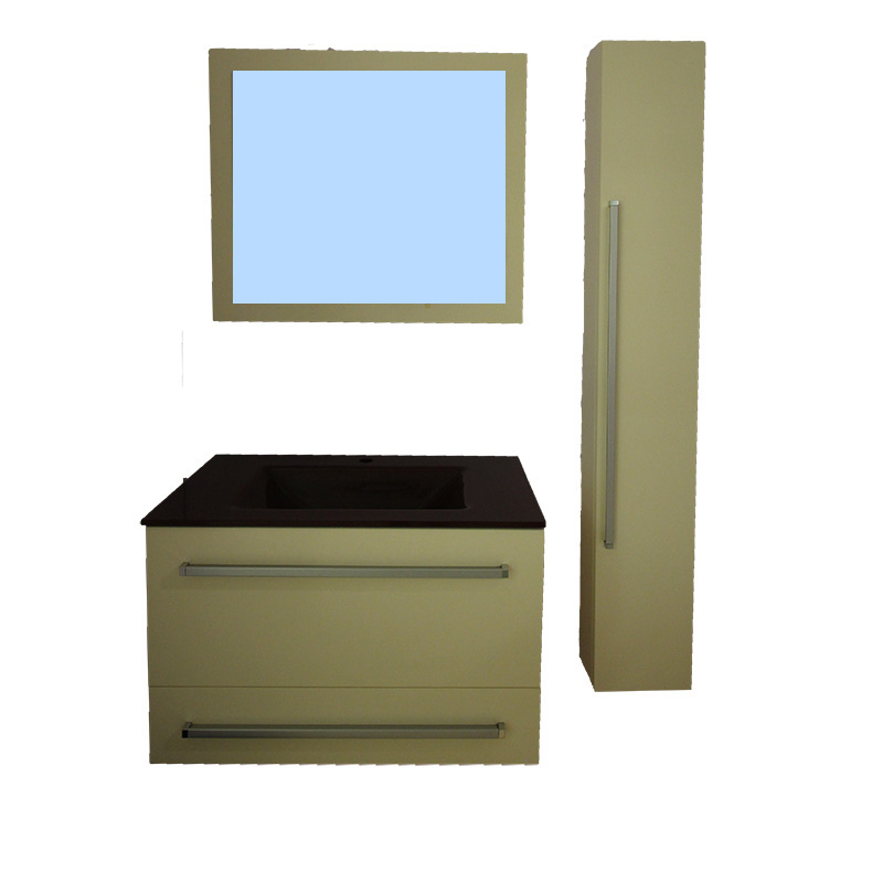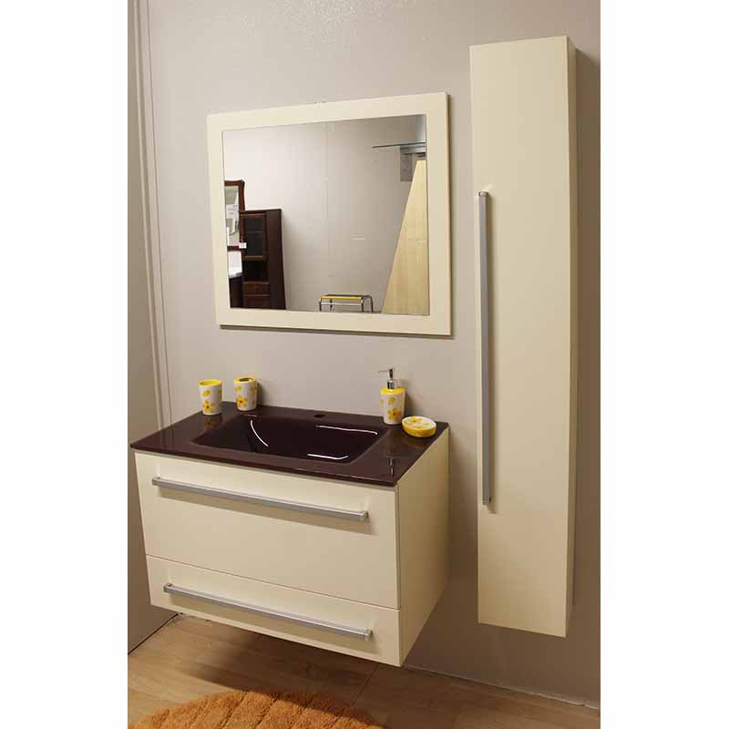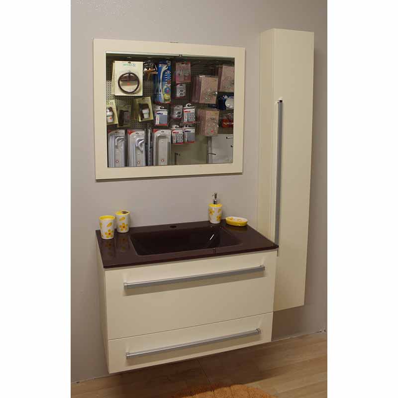 Mobile Bagno sospeso Violet con due cassettoni beige con maniglia lunga. Piano in vetro Prugna, specchiera beige. Colonna pensile abbinata al bagno compresa di ripiani interni.