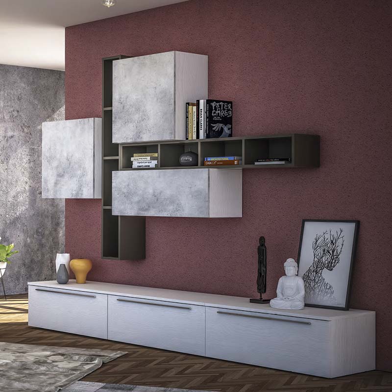 - struttura: bianco frassino; frontali elementi sospesi: finitura cemento; elemento a giorno sospeso in orizzontale e verticale: finitura fango.