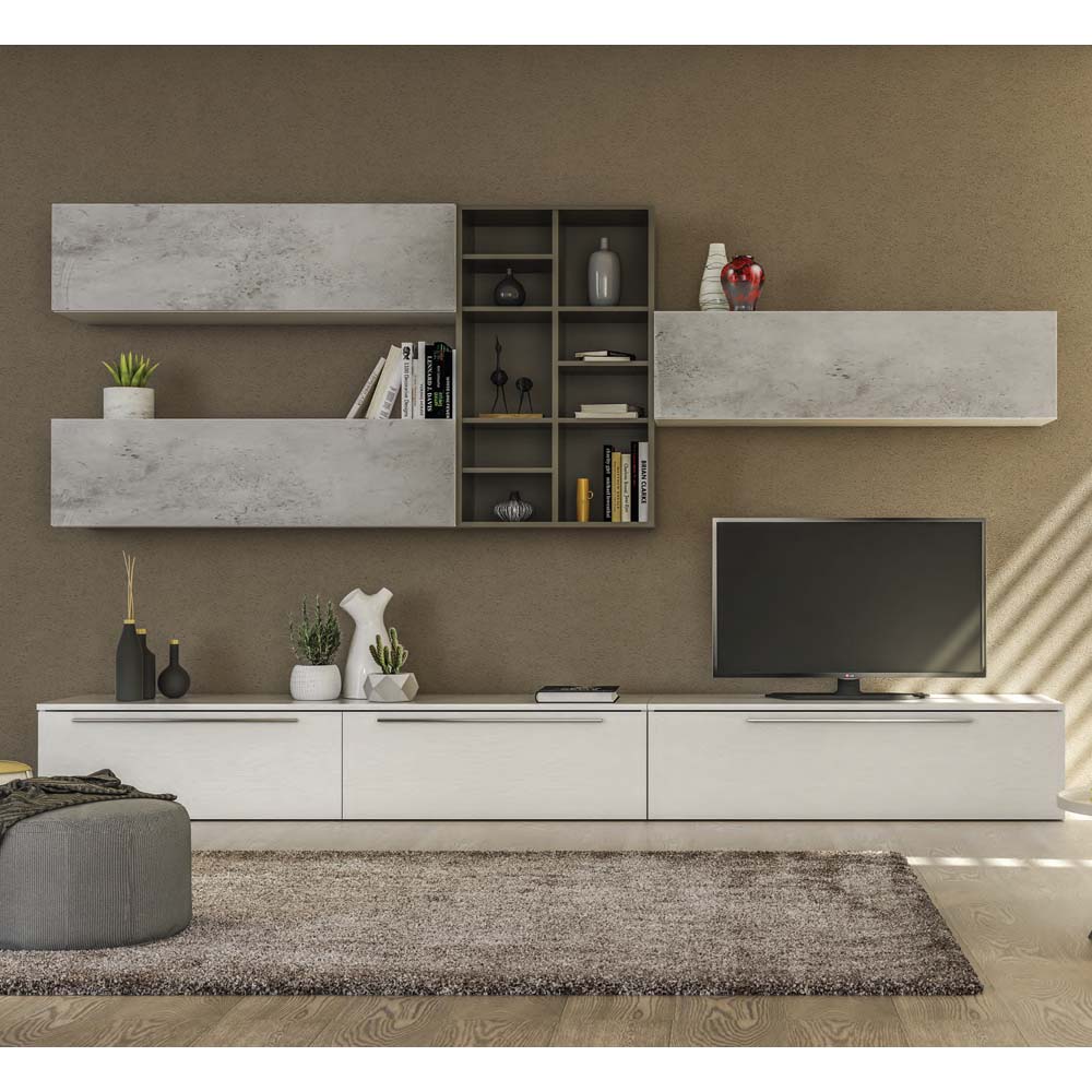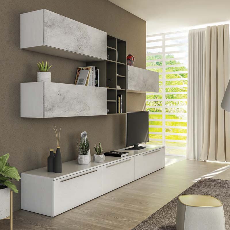 Parete soggiorno Merida, composizione fresca e moderna. Disponibile in due varianti di colore. Componibile in base alle esigenze e allo spazio a disposizione.
