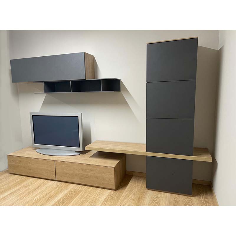 La parete soggiorno è un sistema modulabile, quindi componibile in base alle esigenze del cliente. E’ possibile progettare in fase d’ordine la parete soggiorno utilizzando diversi elementi/moduli disponibili. Possibile scegliere tra ante e cassettoni, colonne, elementi appesi, mensoloni, elementi a giorni. Nella parete soggiorno in foto abbiamo utilizzato due moduli cassettoni da L.100 cm cad. , mensolone in effetto rovere nodato spessore 5 cm, colonna con ante in effetto materico stone gray. Pensile vasistas L. 147 cm e vano a giorno in effetto stone gray L.147 cm .