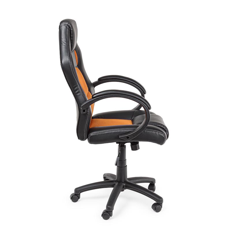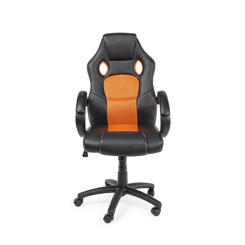Base in nylon ø60cm. ruote in nylon. seduta e schienale imbottiti con rivestimento in rete ed similpelle. schienale provvisto di supporto lombare. braccioli in plastica (pp) con parte superiore rivestita in similpelle. altezza regolabile. da assemblare.