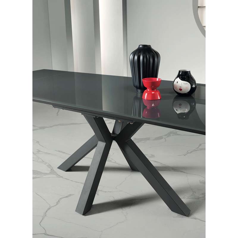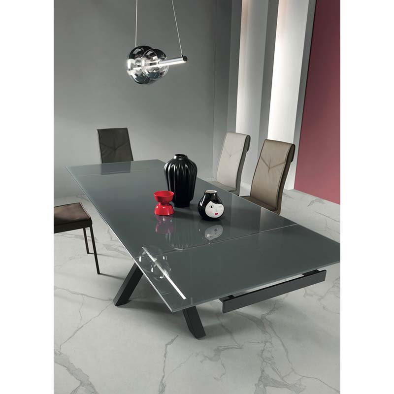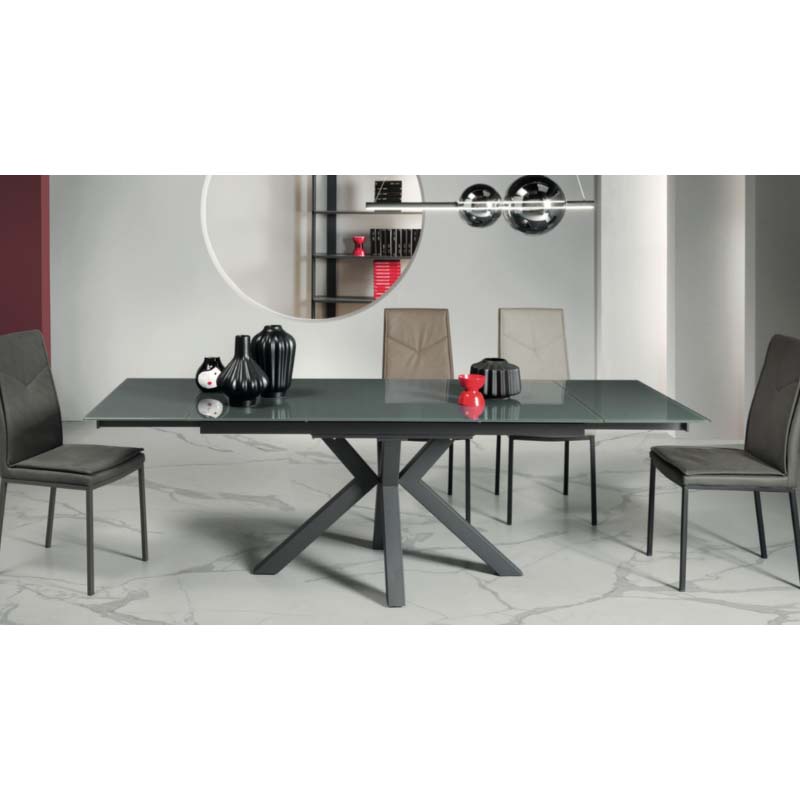 Tavolo allungabile Jacky in vetro è realizzato con piano in vetro fumè con gambe tono su tono in metallo. Giusto rapporto qualità/prezzo senza rinunciare al desing e la qualità. Facilmente apribile e allungabile basta tirare verso l’esterno le due prolunghe.