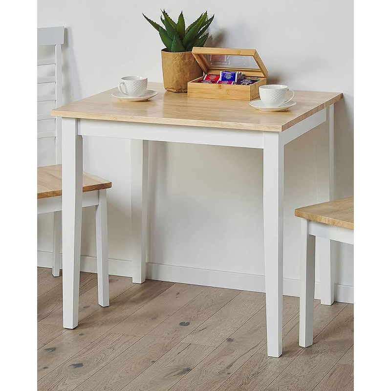 Tavolo quadrato 90×90 fisso è realizzato con struttura in legno bianco e un piano in melaminico effetto legno naturale.
